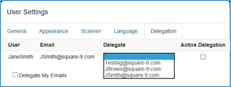 When Delegation Managers log into GlobalSearch, they will see a Delegation tab in the User Settings dialog box. In addition to the delegation checkbox of a user, they will see the usernames and email addresses of those they manage who have Allow Delegation enabled. Manager choose a Delegate email for each user and has the ability to turn Delegation on or off for their users at any time.