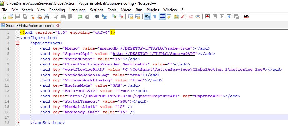 Add the following line to C:\GetSmart\ActionServices\GlobalAction_1\Square9.GlobalAction.exe.config