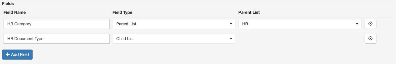 - Add a field for HR Document Type, choosing Child List for the Field Type. Note that while a Child List is not required to be specified, when using a Child List it must always come immediately after the Parent. There may be legitimate use cases for a Parent List without a child, but using a standard list should be considered for simplicity in these cases.