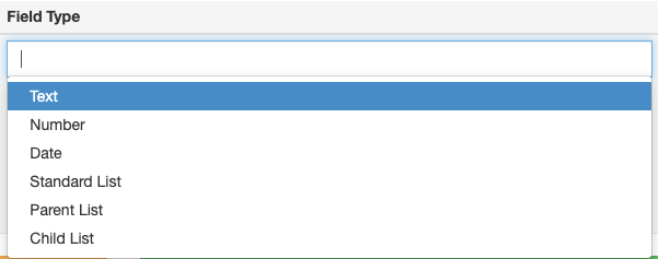Parent and Child Field Types are used to control input with a special type of input that relates one list (a Child List) to a value selected in a Parent List. Parent and Child Lists are an advanced topic, separately documented here.