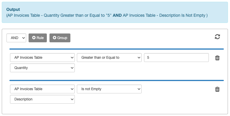 Output - This displays a written summary of your rule configuration. This is useful in understanding the construction of your rule and when it will be evaluated as true.