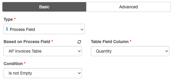 Conditions can be applied to Table Fields, allowing you to make routing decisions based on individual line items. Apart from Contains All, Empty, and Is Not Empty, all other Table Field conditions are evaluated on a per row basis.