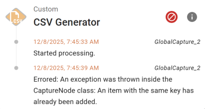 “Errored: An exception was thrown inside the CaptureNode class: An item with the same key has already been added.”