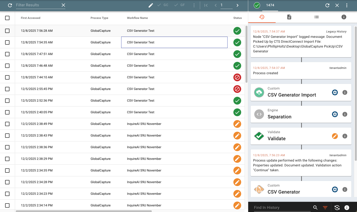 The CSV Generator node spawns an additional output and process in GlobalCapture and therefore requires two outputs: Original Process and CSV File.