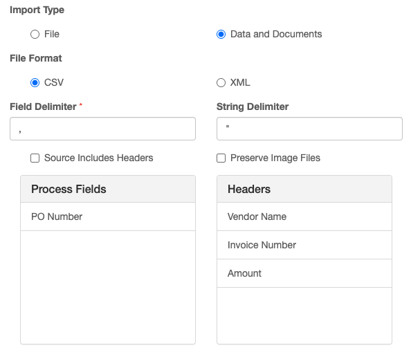 This CSV uses a comma ( , ) as a field delimiter, a ( “ ) as a string delimiter, and contains headers. If GlobalCapture fields for Vendor Name, Invoice Number, PO Number, and/or Amount exist, the data will automatically be added to those fields.