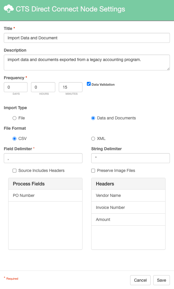 In this example, The node is configured to import data and documents. The CSV file does not contain headers, the field delimiter is a comma and the string delimiter is a pair of quotation marks. The CSV contains Vendor Name, Invoice Number, and Amount in that order. This process will run every 15 minutes.