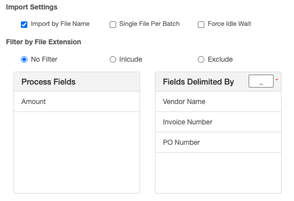 Allows you to use data in the file name in index fields. When enabled, move fields from the Process Fields column to the Fields Delimited by column, and enter the delimiter. The data in the name will populate the fields in the order they are listed.