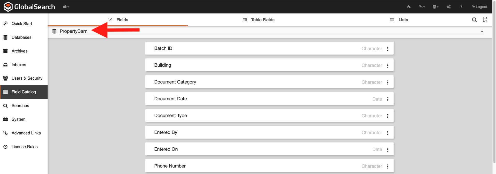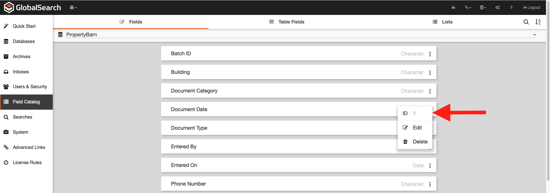 ) next to the field of interest.The ID is the field number. In the image below, the Document Date index field is Field5 in the ssFields table of the database.