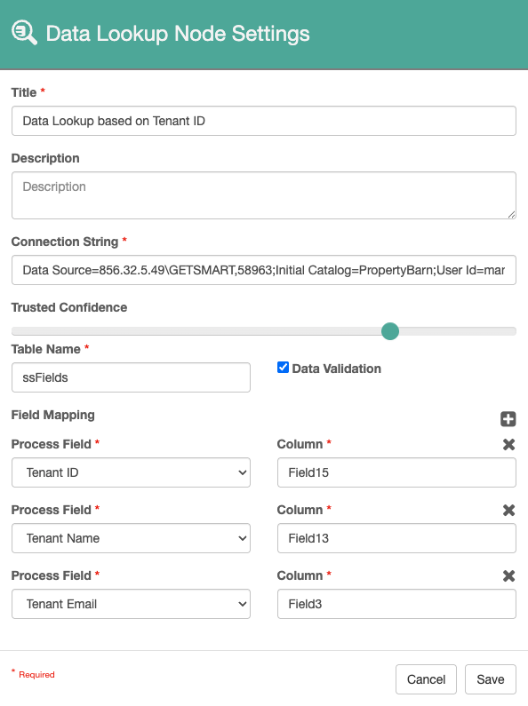 You can set the amount of “confidence” you have in the accuracy of the data in the Process Field. By default, data in all Fields have a confidence level setting of zero. When you manually enter data, set data in Validation, or set data using the Set Process Field node, that Field will be assigned 100 percent confidence. When the Data Lookup Node is executed, any Fields that contain data with a confidence greater than the threshold that you have set, will be used to look up data in the data source.