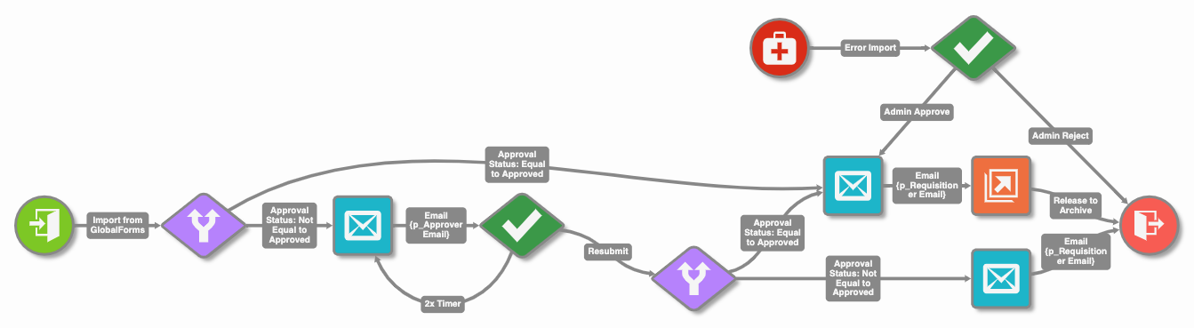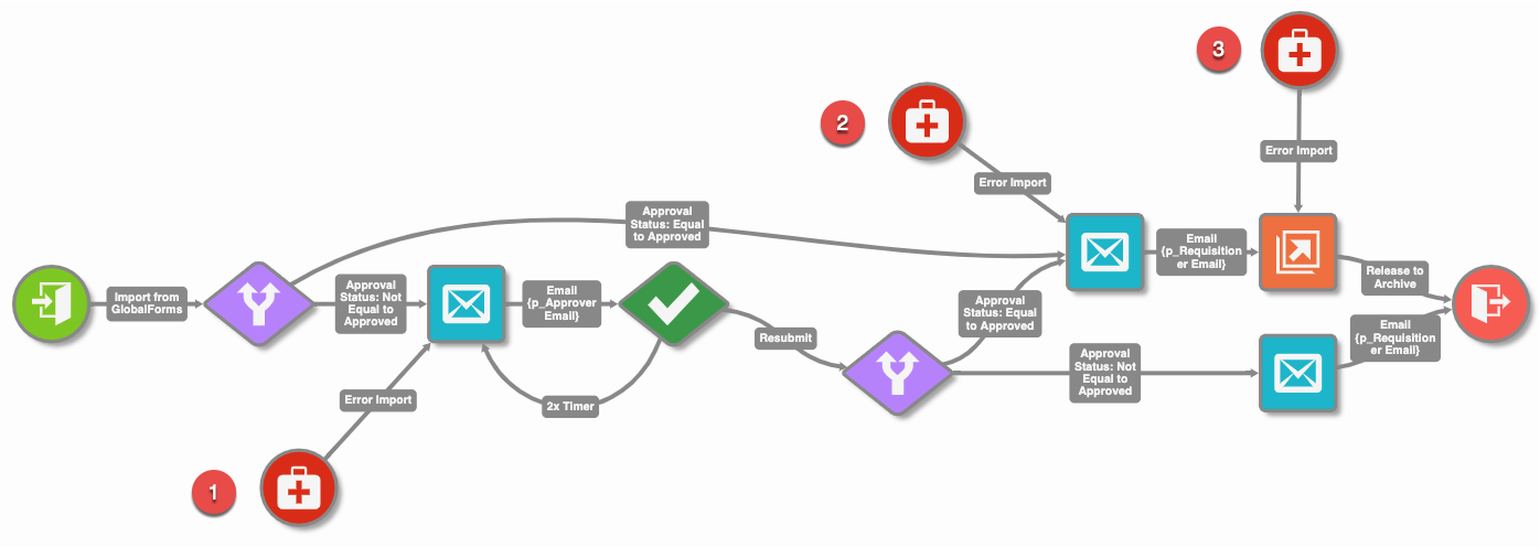 In this example, 3 Error Import nodes are leveraged. Each node is monitoring for processes in error from the node they target. In this example, we are going to perform a perpetual retry any time an error occurs in sending an email (1), sending an email (2), or releasing to an Archive (3).