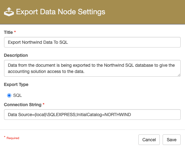 Connection String: This is the connection to the SQL Server and database where the data will be exported to.