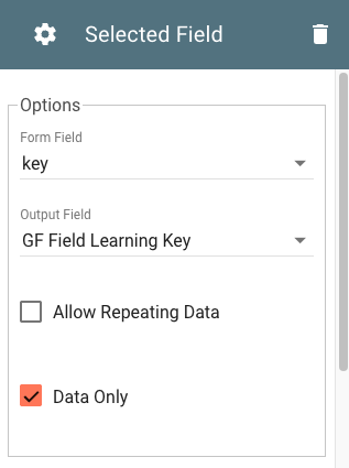 The Field is a dropdown list of all available process fields. This is the field we will match when retrieving data from the datasource in a GET call. This is the Key for the lookup.