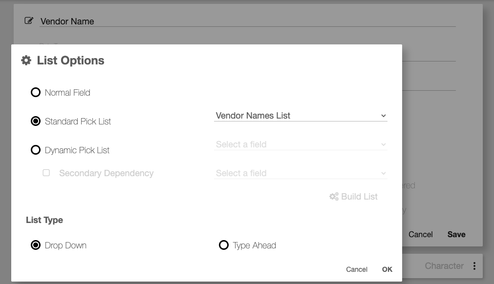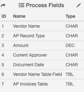 The Table Column Mapping is where we can use S9 notation, to set the values that reference the columns of the Table Field. This is what will appear in our list for our Vendor Name process field.