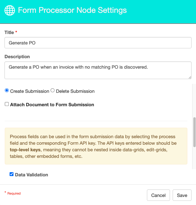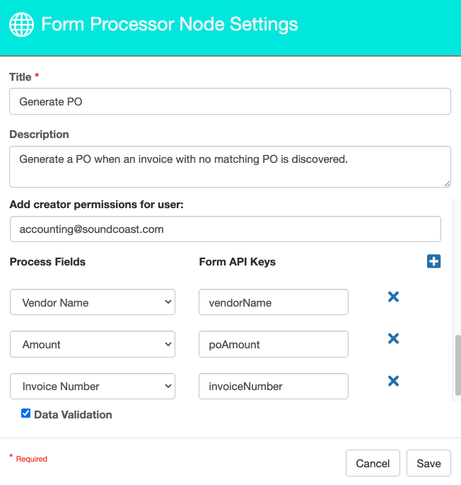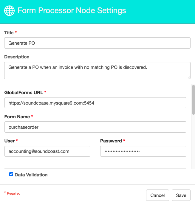 The Data Validation checkbox is enabled by default to enforce Data Types or Length settings for Fields. When enabled, if data does not meet the type or length settings for the field, the process will error on this node.