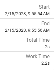Total Time - This value is the total time elapsed for the entire workflow process, from the Import to the End node. This includes time waiting for user interaction in Queues and Validation.