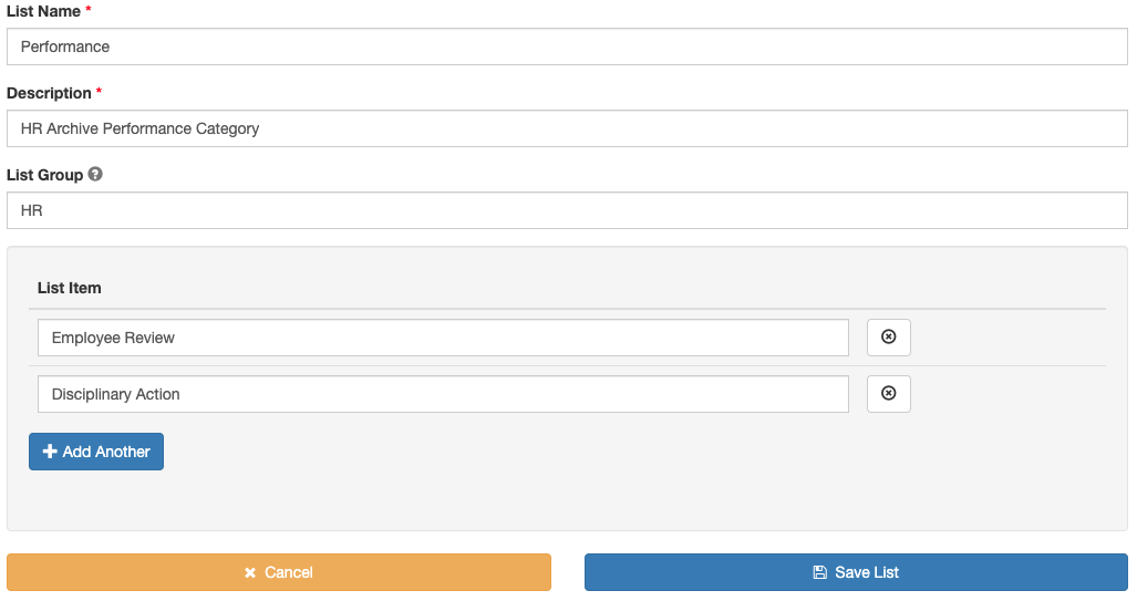 - Add the lists items for this Category (in this example, the Performance category). List items for Performance Review and Disciplinary Action will be added here.