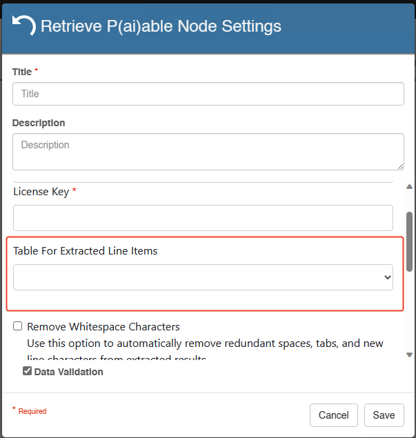 Since the field set for table extraction is finite and less likely to change, the node allows for field mapping. This differs from Header fields, where the process requires specifically named fields that can later be reassigned in the workflow.