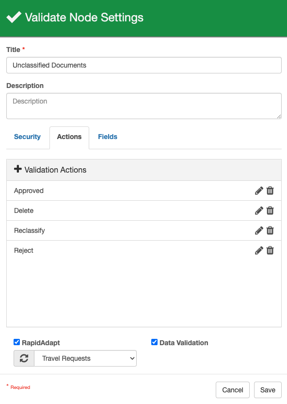 You can set multiple different types of Validation Actions for the Node on the Actions tab. The Actions taken will affect which step the document proceeds to in the process. User Actions require manual responses in the Validation Station. System Actions are triggered by timers, OCR results, or resubmitted web forms. You can also create Actions that are a combination of both User and System Actions, where a user triggers a System Action manually.