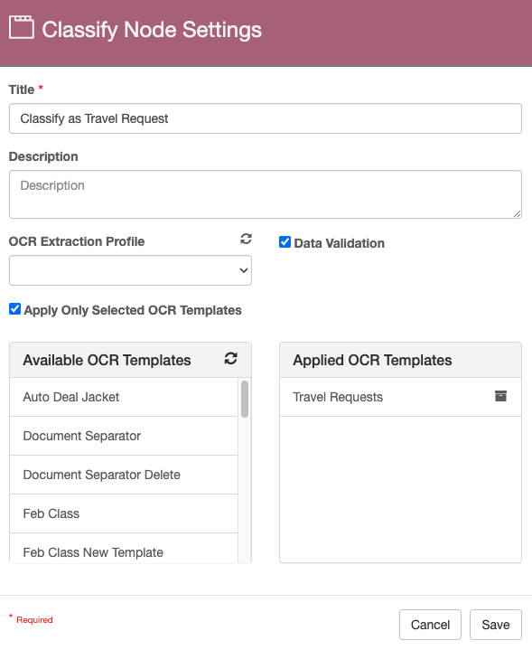 In this example, we'll focus on configuring the Validate node for Rapid Adapt. When a document is unclassified, you can route it to a Validation node with Rapid Adapt enabled. The user can then create a template to extract data from this document. The template is added to the Travel Requests templete group, and then can be sent back to Classification to have the new template applied.