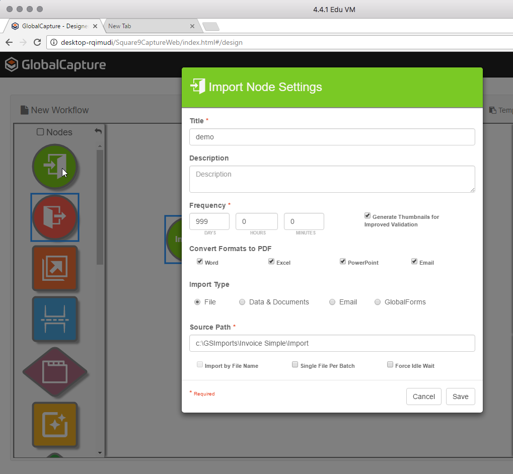 In GlobalCapture, the building blocks of a process are referred to as Nodes. Each Node represents a distinct action within the process that the administrator must configure.