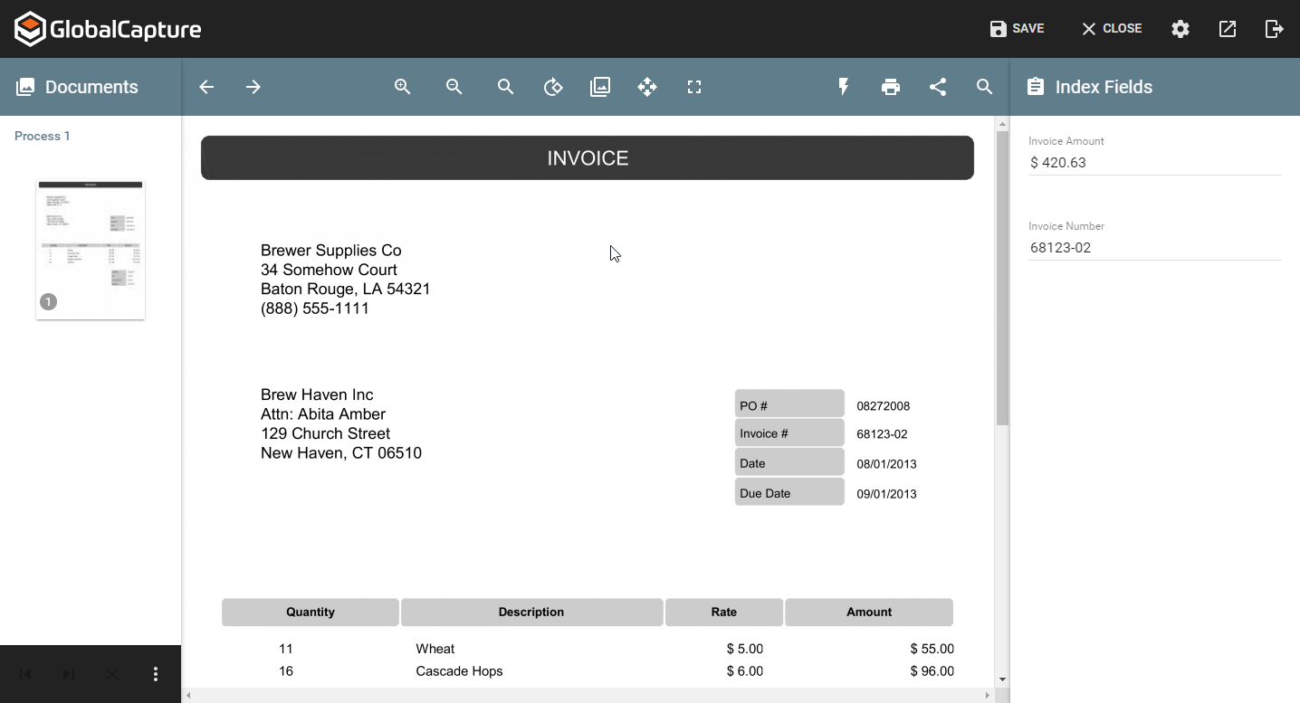 To experience Zoom to Zone features, open a document in validation that has been OCR'd using any Zonal, Unstructured, or Table extraction rules. In the Validation viewer, place the mouse cursor in a field and the viewer will automatically snap you to the text that was extracted as in the example below.