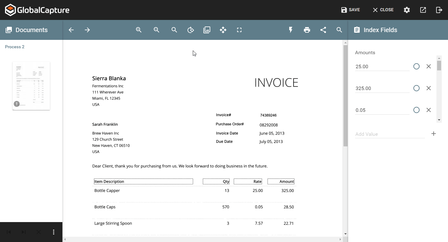 Zoom to Zone works with any field type, including Multi Value and Table Fields. You can zoom to the extract area by clicking, or if the indexer already has mouse focus, by using the Tab key.