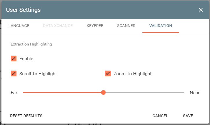 - Zoom To Highlight - Available after “Scroll to Highlight” is turned on and enabled by default, this setting causes the viewer to automatically zoom in to an extraction highlight. This zoom scale can be configured with a slider below the “Zoom to Highlight” checkbox. There are five settings between “Far” and “Near”. These five zoom settings will zoom the viewer to where the extraction highlight consumes between 10% and 50% of the viewer area. The default value for this setting lies in the middle of the slider, equal to 30%. Note that the viewer will never zoom out further than the fitting width of the page. Also, in the cases of extremely small extraction highlights, the viewer may not be able to zoom to the desired percentage of real estate. In these cases, the viewer will zoom to the max amount allowable.