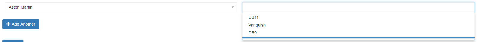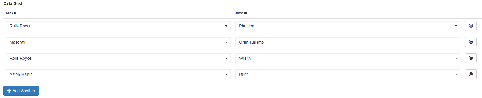 Often times it can be useful to filter lists of data based on other data elements. This is commonplace in various accounting and human resources scenarios, but the most understandable example to all users might be a list of vehicle makes and models. In this scenario, two lists are used. The first represents the makes (or brands) of vehicles. The second list should dynamically populate based on the user's selection in the first list. For example, if a user were to select "Aston Martin" from a list of vehicle makers, they might expect to see only Aston Martin vehicles in the Model list. The resulting data grid might look like this: