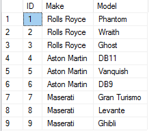 To implement this example, a database will be required containing the vehicle information. A simple table with Make and Model columns is all that is required: