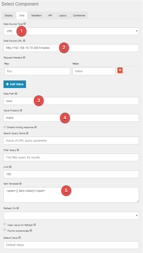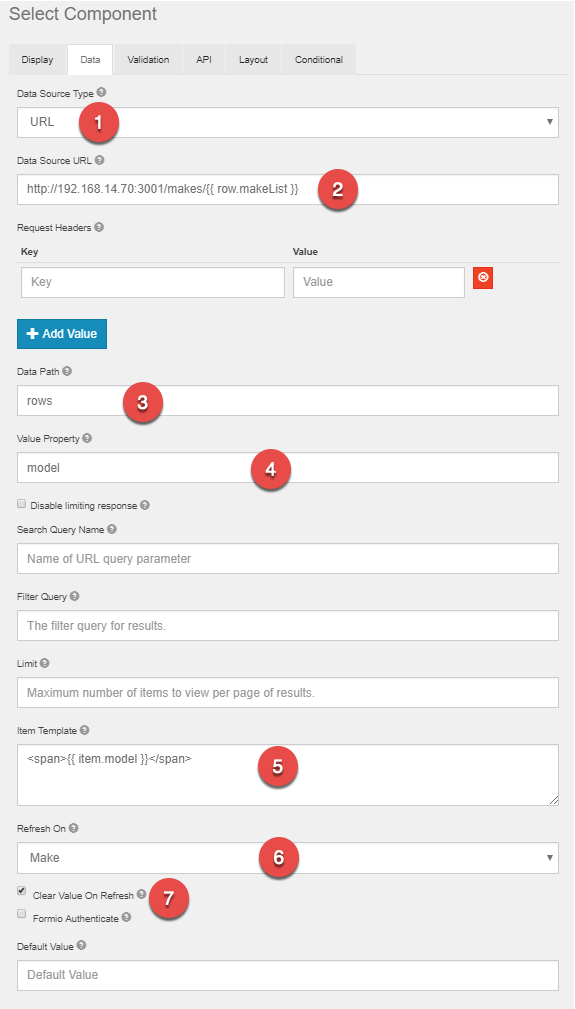 - Specify the location of the Model route. The path should be found at http://<customerserver>:<customerport>/makes/{{ row.makeList }} if the example above was followed. Pay particular attention to the end of the URL and the Handlerbars expression specified there. It's here where the data from a particular row's Make list is passed into the route to retrieve the appropriate models.