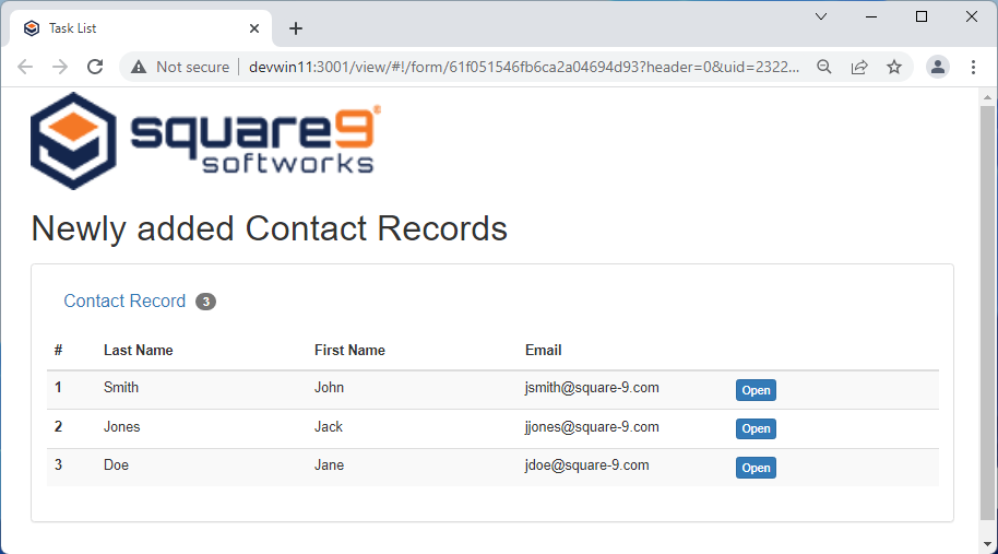 In the example above, this simple list shows submissions from a Contact Record form used to collect name and email address. Clicking the open button in each row will take the user to the live form for that transaction. You can see how such a list may be helpful in for advanced form workflows.