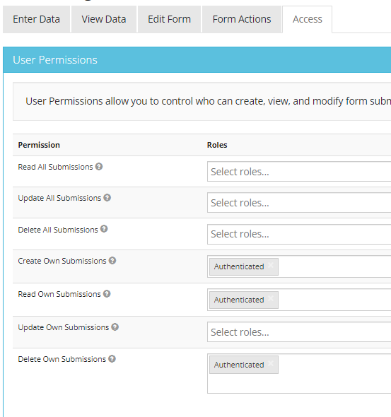 The default security for newly created GlobalForms is shown below. Note how Read All, Update All, Delete All have no users defined and only Authenticated users can access their own submissions. This allows for the highest amount of security when it comes to accessing a form’s submission data.