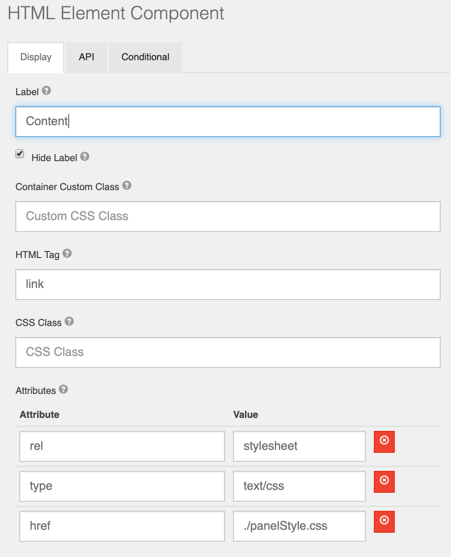 - Add a new HTML Component to the top of the form and reference the CSS file. The properties should look like this: