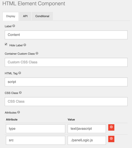 - Add a new HTML Component to the top of the form and reference the JS file. The properties should look like this: