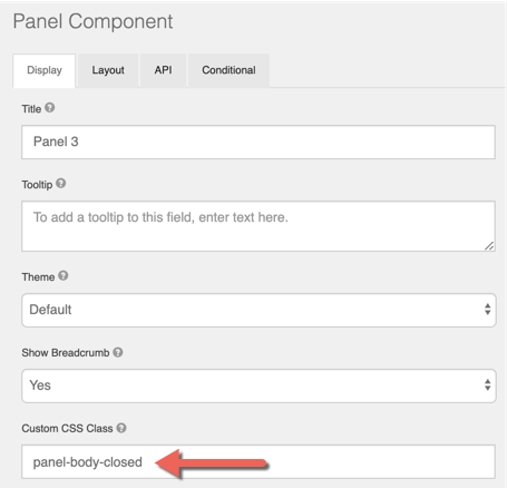 - Add a panel to the form. Any panel that should have Collapse / Expand ability needs a value added to the Custom CSS Class property of the component. Possible values are panel-body-closed or panel-body-open. Use the appropriate class to identify the panels default state of open or closed.