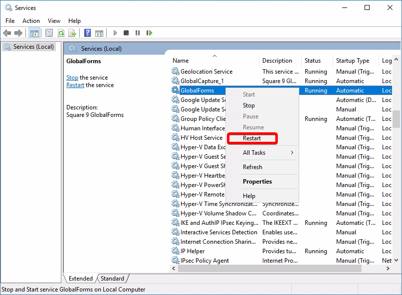 - Once you have configured your routes, restart the GlobalForms service. All changes will require a restart of the GlobalForms Service.