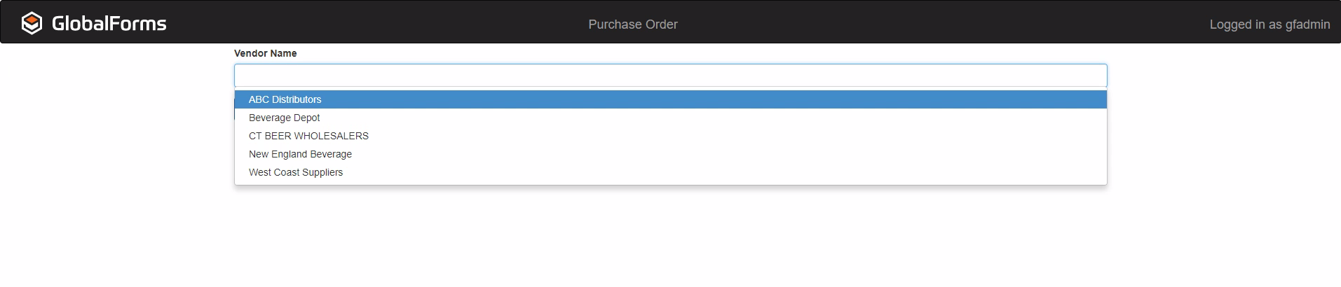 Using GlobalForms 10 it is possible to access information stored in a SQL database to dynamically populate information onto forms. This example will show you how to take a field within GlobalSearch and pull all of the values into a select component, which would appear similar to a drop down control.