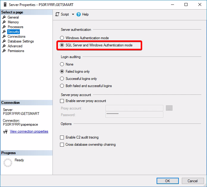 - Right click on the server name from within SQL Management Studio and make sure that your server is using SQL Server and Windows Authentication mode under the Security section.