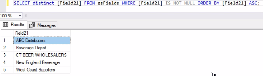 "query": "SELECT distinct [Field21] FROM ssFields WHERE [Field21] IS NOT NULL ORDER BY [Field21] ASC;"