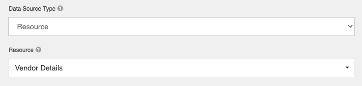 Select Components can be used for accessing resources and their data from another form. On the Data tab, select Resource as the Data Source Type, then choose an item from the Resource dropdown. Note that the user interacting with the form will also need read permissions to the Resource to pull data correctly. In the example below, a Resource named Vendor Details is selected.