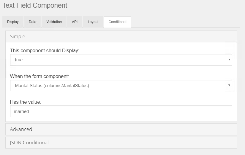 Using a Simple conditional, set the display to true, when the Marital Status control has the value of married. Note that Simple conditionals only operate against the selected control. You can show / hide a group of controls by placing them all in a Layout Component like a Columns control, and setting the conditional logic on the Columns control to effect the display of everything within it.