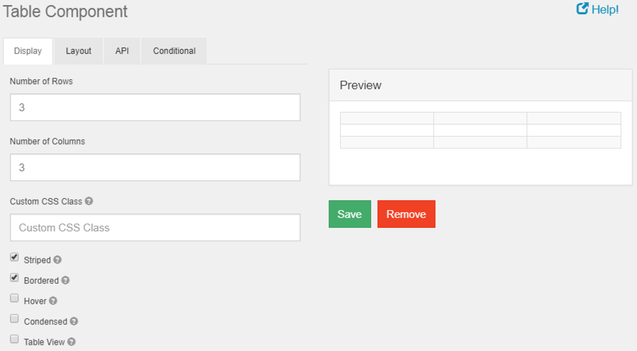 Use the Table component to create a table of columns and rows that can contain other components. Tables are generally used for styling static tables of input. At design time, you will configure the number of rows and columns in the table.