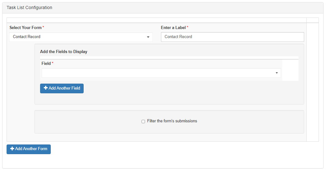 In the Task List Configuration section, select the form you wish to add. With a form selected, the Label will automatically populate with the selected form’s name. While you don’t need to change the label, in cases where you will be adding multiple forms, or the same form multiple times with different filters, use the label to provide specific details about the list.