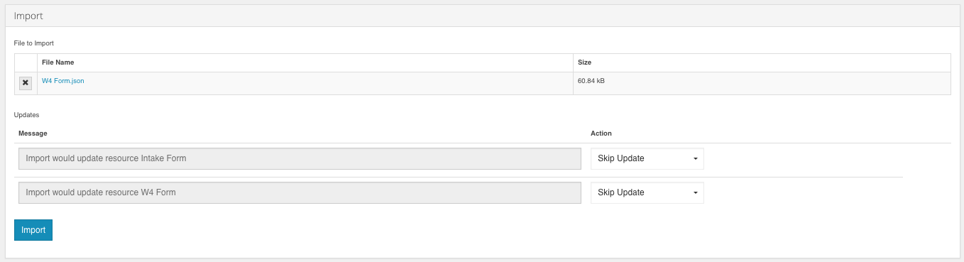 In the example above, a W4 Form export was selected. This form also references a Resource call Intake form. As mentioned earlier, exporting a form carries any referenced resources along with it. The form designer can choose how to interact with each object in the export. The Message box instructs the user what is happening with each object. Update the action to identify how GlobalForms should handle the import process. Options include:- Skip Update: This option means do nothing with this object.