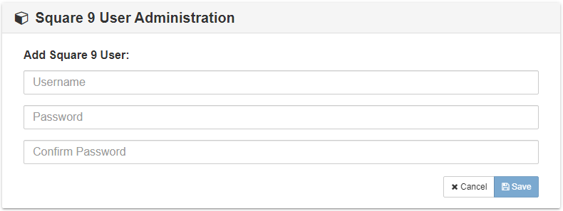 - Create a new user in the Square 9 User Administration section of the User Management page. In the Username field, provide the new user's email address. Then provide a password that is compliant with your organization's password policies.