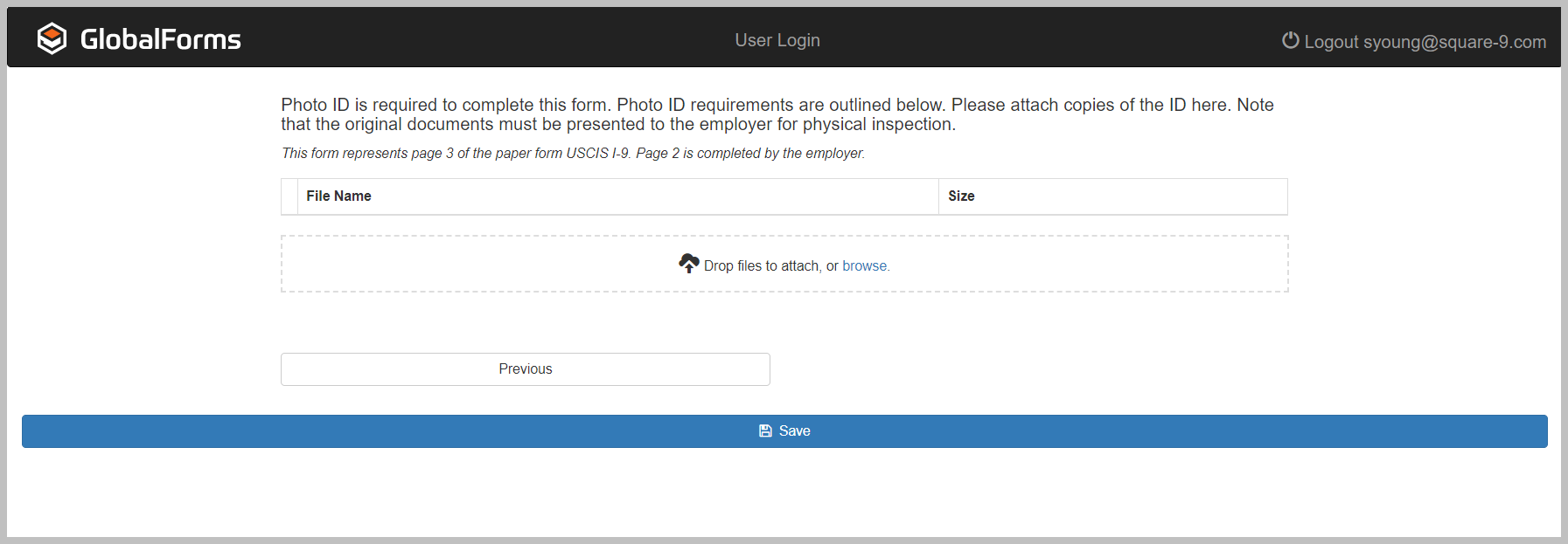 The process logic for completing the I-9 form and providing the supporting documentation is built directly into the GlobalForms web form. The form appears in the familiar Federal I-9 layout with text fillable fields that the employee can quickly complete. It also includes an e-Sign compliant digital signature field so that the employee can legally attest to the accuracy of the information they are providing. Once the employee has completed the form, the hiring manager then attaches the required two forms of photo identification to the completed form through a simple browse function or drag and drop process. Once the hiring manager provides the back up documentation, they simply save the form and the process is complete.