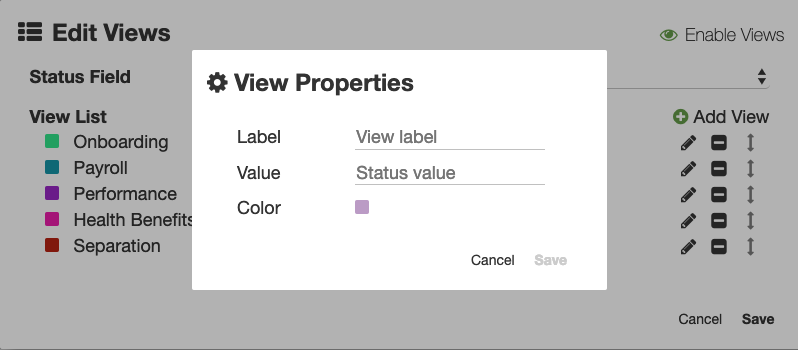 - When adding a view, the View Properties Screen will open. Enter the Label for how the View will appear in a search result and the Value (must match a pick list value. Optionally the default color of the tab can be changed by clicking on it and selecting the new color.
