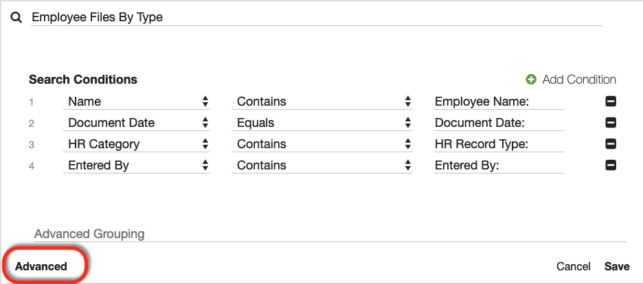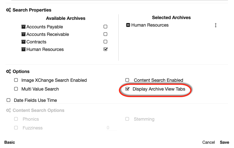 The unique design of GlobalSearch C2 for Business Essentials allows you to take advantage of View Tabs which automatically categorize your documents based on a field value. In the case of the Human Resources archive, the tabs represent the different document categories in an Employees file. These include; Onboarding, Payroll, Performance, Health Benefits and Separation documents. In the event you decide to Add or Change values within the HR Category Field list, you will also need to update both the archive and the search to have it appear as a view tab.