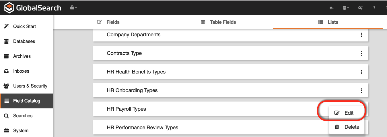 - Click the ellipsis on the right side of the the selected list and click Edit. in this example we will elect to modify an HR Payroll Type list
