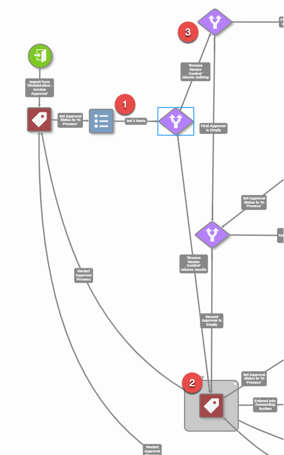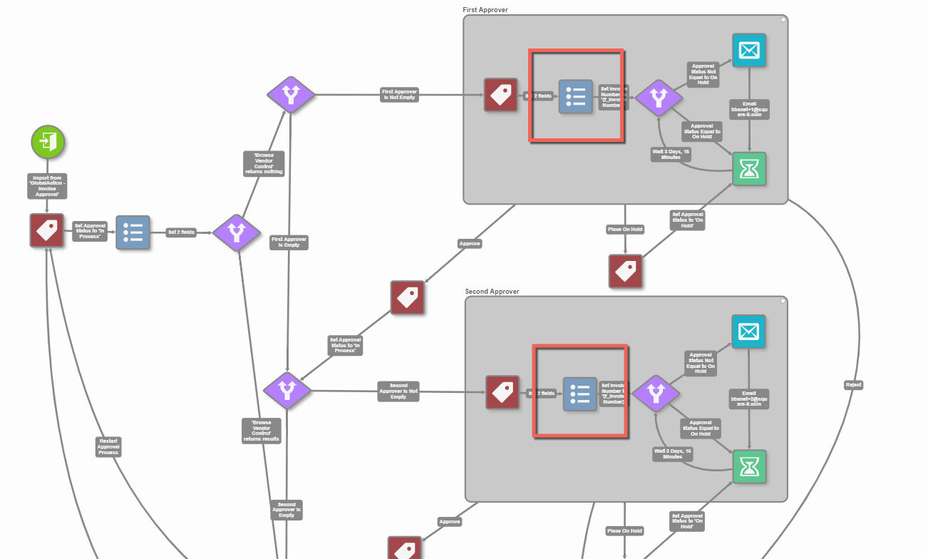 - Remove the entry for Vendor Name from the Set Process Field Nodes in both the First Approver and Second Approver queues.